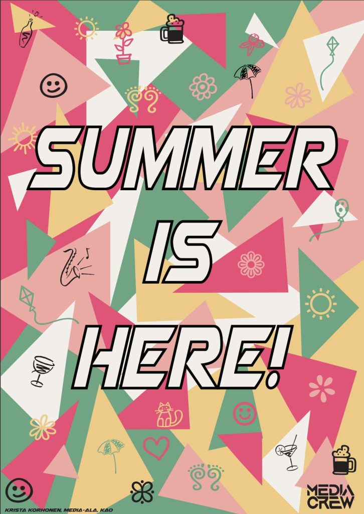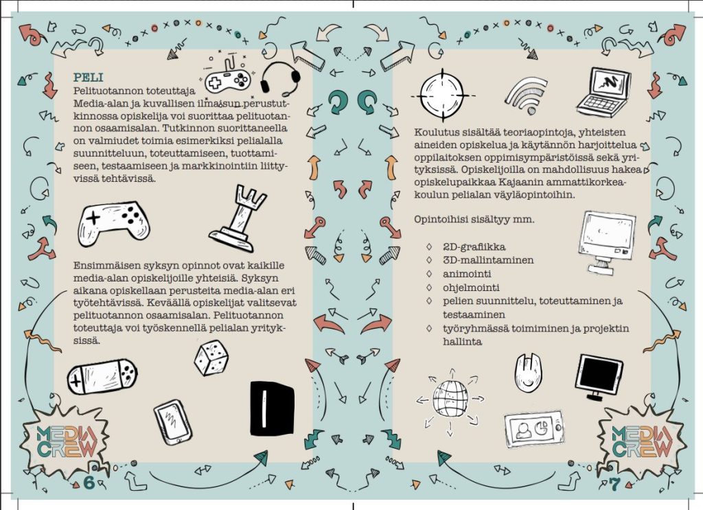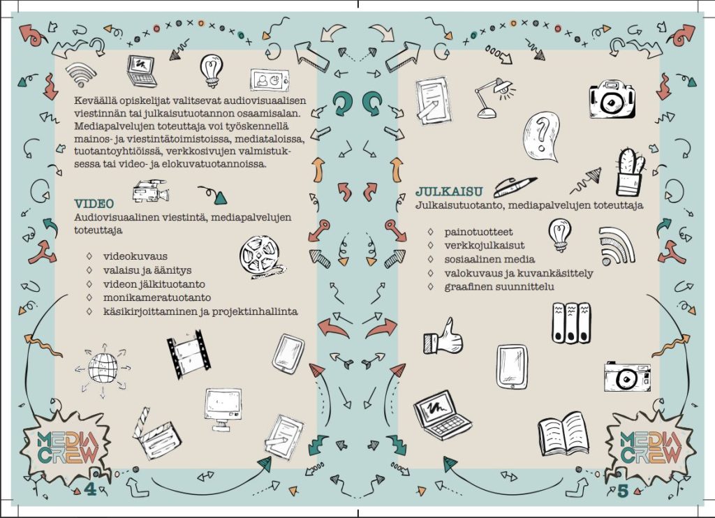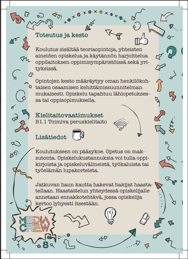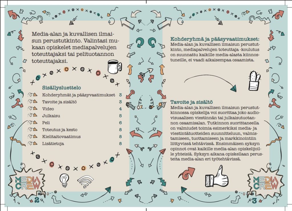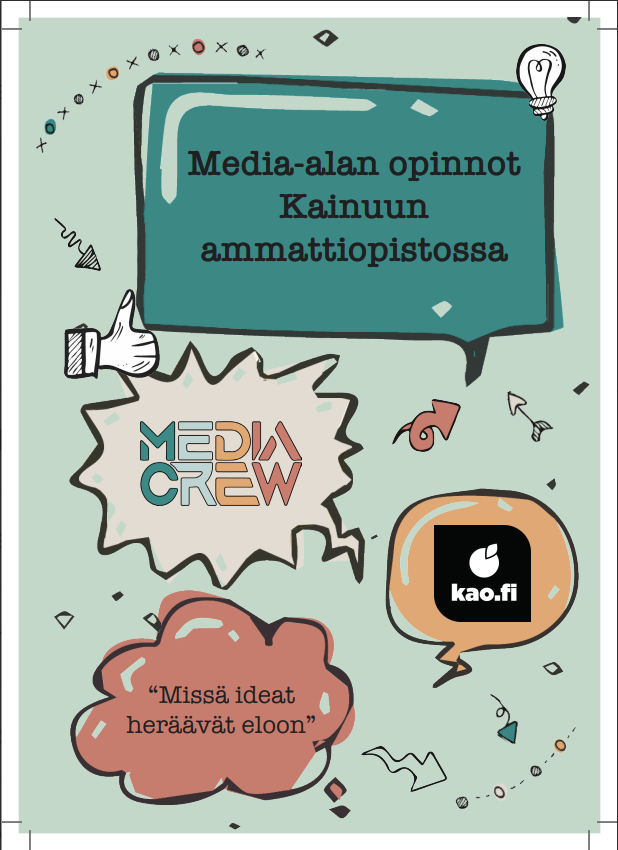 Tehtävänä oli suunnitella iloinen ja pirteä media-alan 8-sivuinen esite ja käyttää annettuja tekstejä.