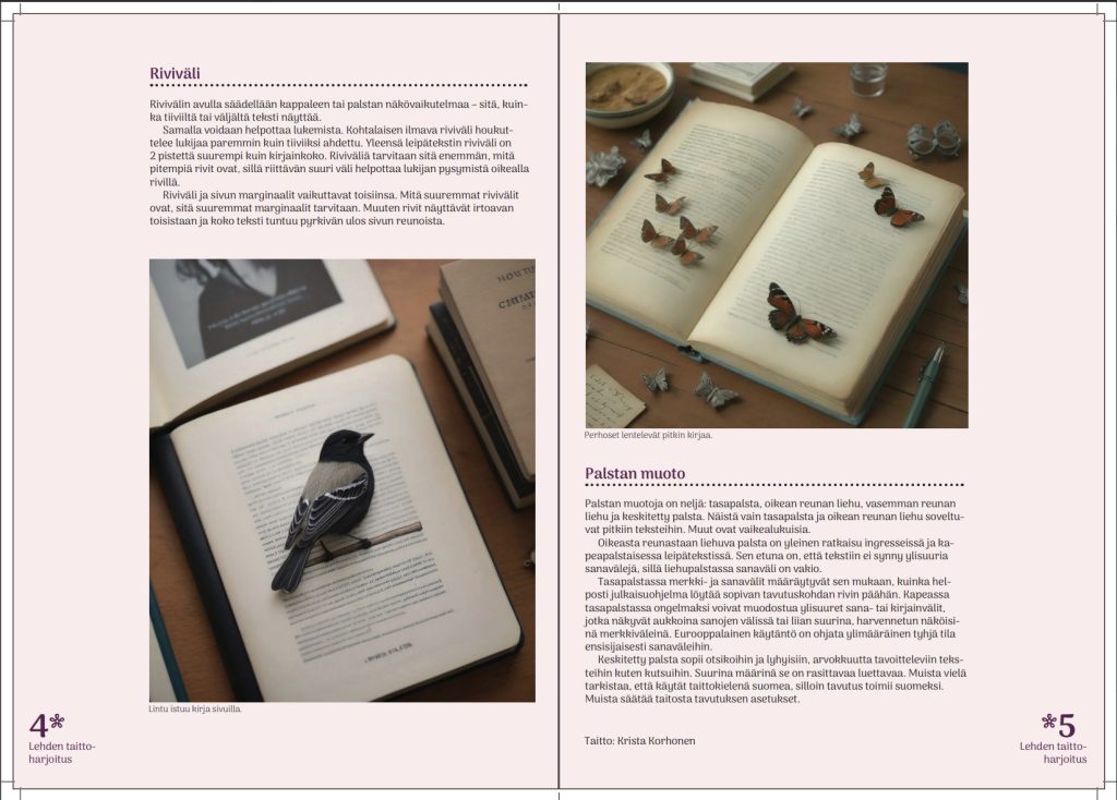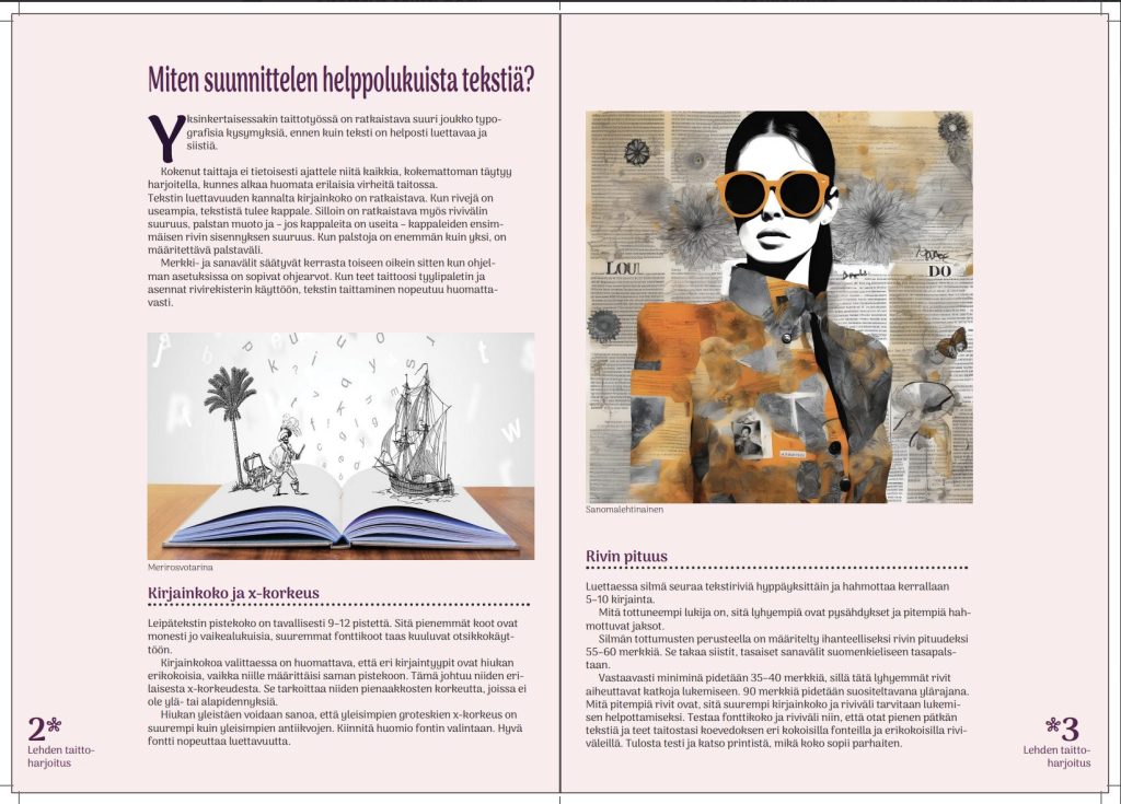 Suunnittelin kaksi aukeamaa (4 sivua), jossa käytin annettua tekstiä. Pyrin helppolukuiseen typografiassa.